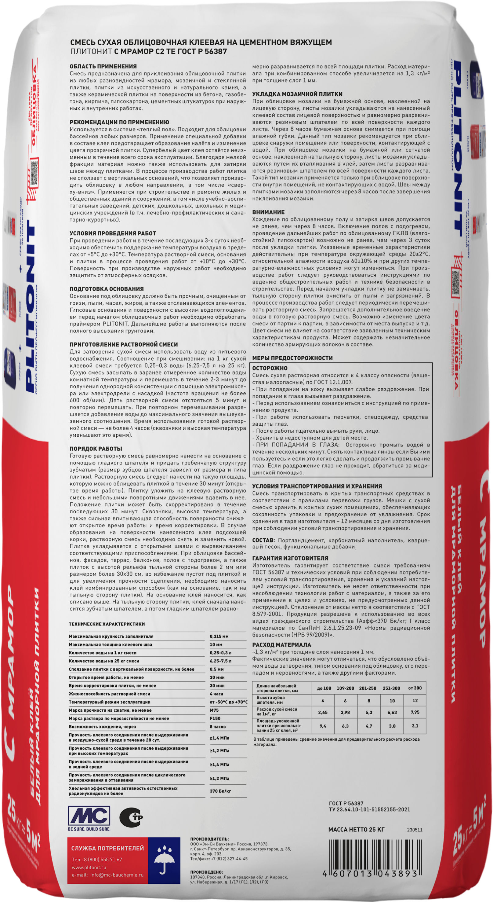 Клей для плитки Плитонит С Мрамор 25 кг - белый клей, предназначенный для приклеивания мозаичной и стеклянной плитки, плитки из искусственного и натурального камня, облицовочной плитки из любых разновидностей мрамора, керамической плитки.