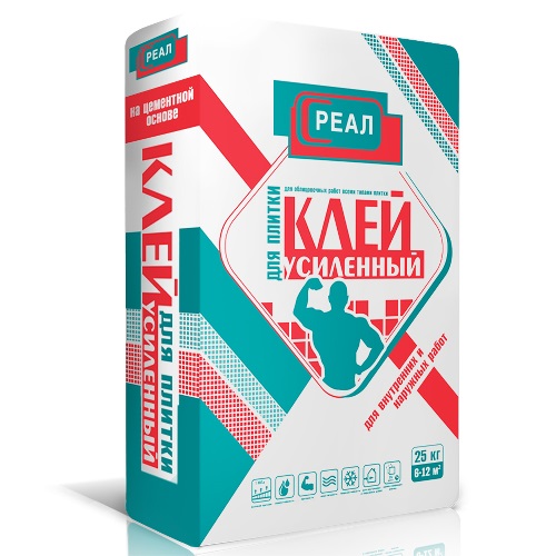 Клей для плитки РЕАЛ Усиленный - это сухая смесь на цементной основе для внутренних облицовочных работ.