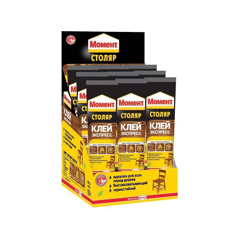 использую момент столяр для ремонта стульев. недавно купил упаковку, очень доволен, клей хорошо и быстро схватывает и сохнет, стоит недорого