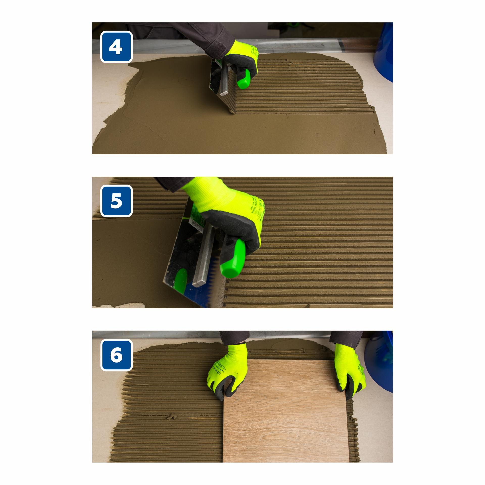 Нанесение таким способом производится при облицовке бассейнов, фасадов, террас, балконов, полов с подогревом, плиток с высотой рельефа тыльной стороны более 2 мм и с размером более 30х30 см- что бы избежать пустот под плиткой и для улучшения сцепления. Нанесите на основание стандартным способом (как описано выше).