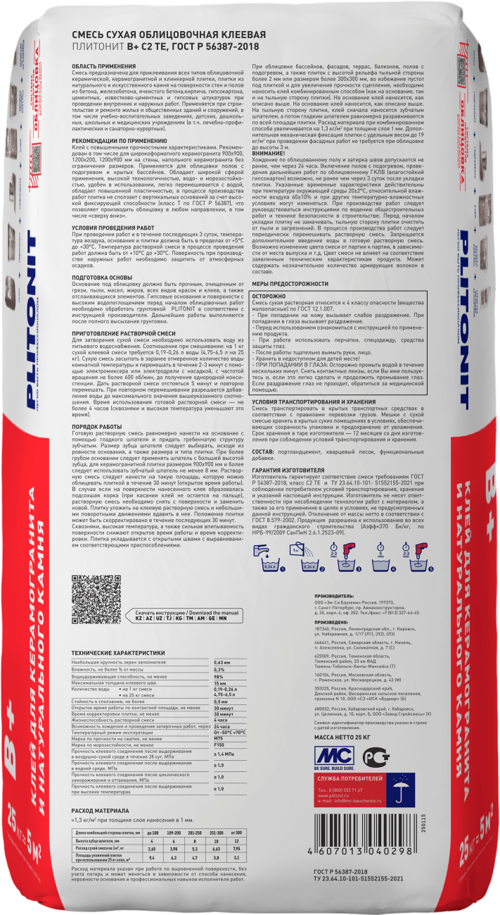 Клей обладает высокой пластичностью, является водо- и морозостойким, стойким к сползанию плитки – таким образом возможно проводить монтаж плитки в любом направлении (в том числе «сверху вниз»)