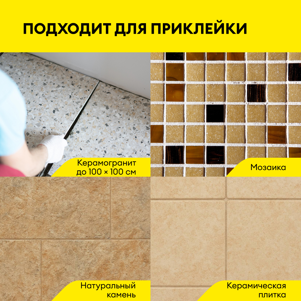 Совместим с гидроизоляцией, надёжен в эксплуатации влажных помещениях, а также на балконах, лоджиях, террасах. Походит также для облицовки натуральным и искусственным камнем.