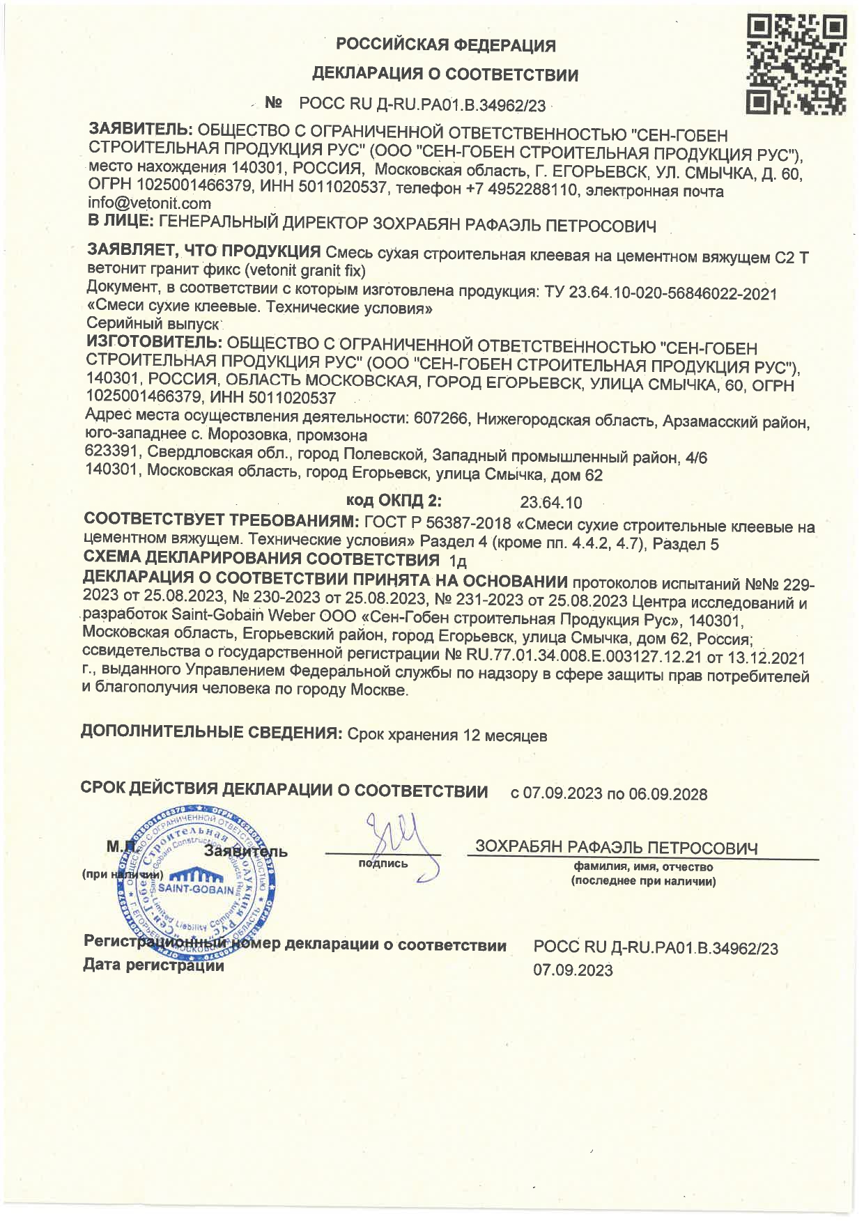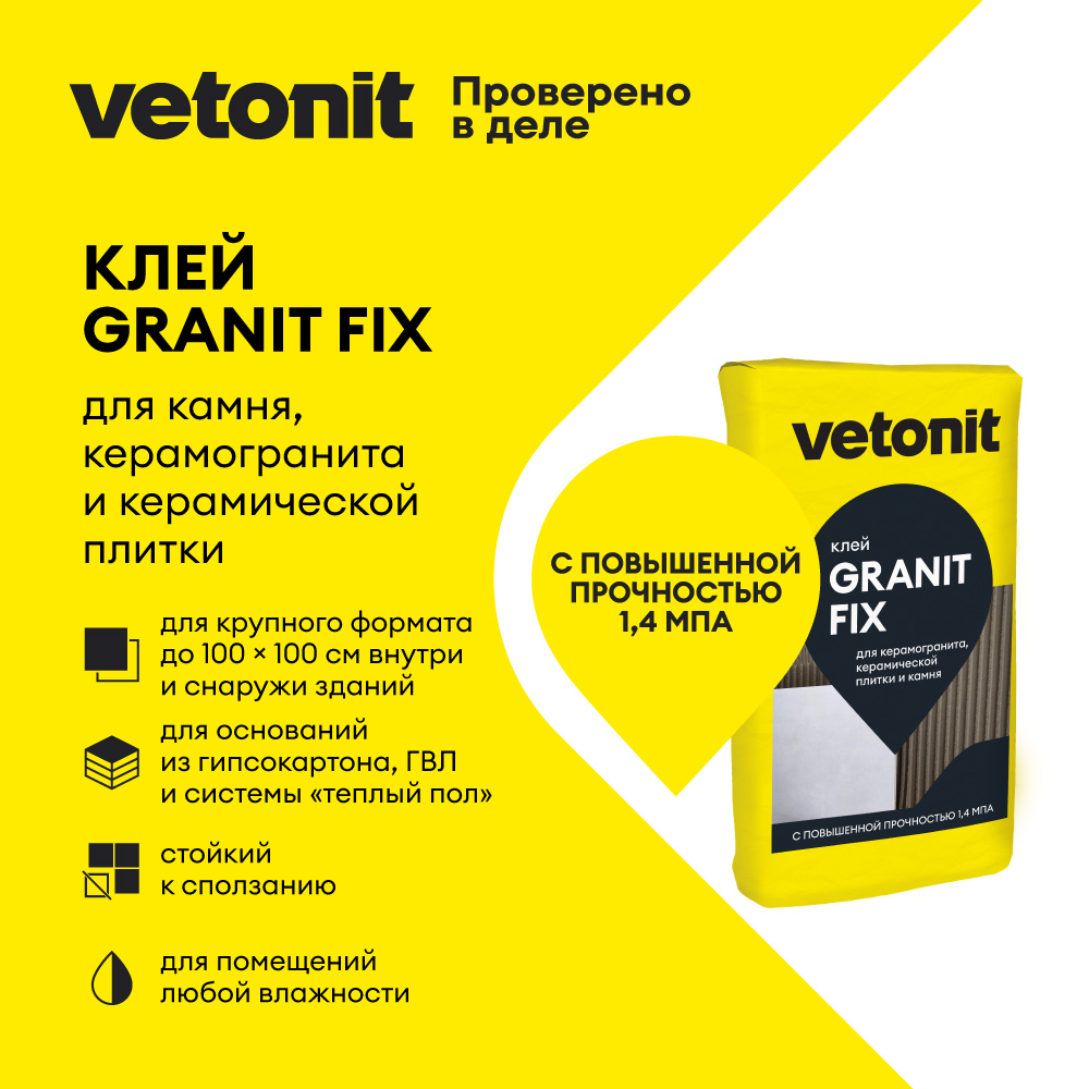 Клей Ветонит Гранит Фикс (vetonit granit fix) -клей класса С2 Т подходит для внутренних и наружных работ, для стен и пола, включая систему «Теплый пол». Рекомендованный формат керамогранита – до 100х100 см.