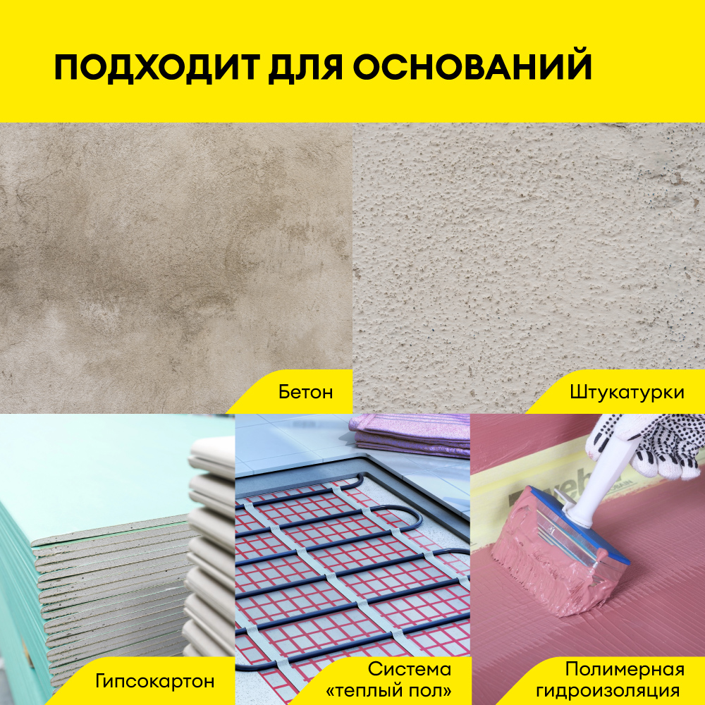 - Подходит для оснований из гипсокартона, ГВЛ и системы "теплый пол"