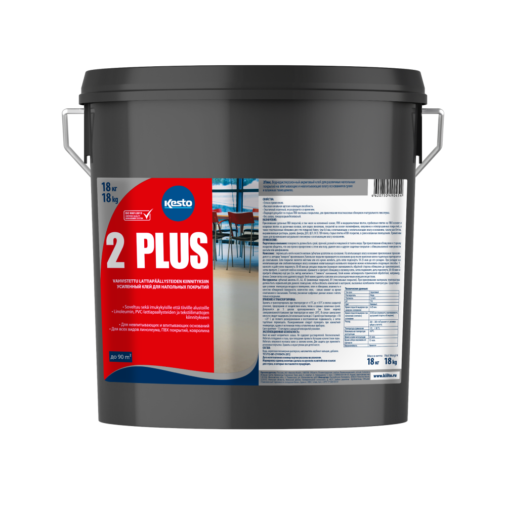 Kesto 2 Plus - воднодисперсионный акриловый клей для приклеивания различных напольных покрытий - рулонных ПВХ покрытий, в том числе на вспененной основе, ПВХ и кварцвиниловых плиток, пробковых плиток на ПВХ основе и ковровых плиток на различных основах, всех видов ПВХ-покрытий, ковролина и иглопрошивных покрытий, а также пластмассовых облицовок для стен толщиной более, чем 0,6 мм, к впитывающим и невпитывающим влагу основаниям в сухих и влажных помещениях.