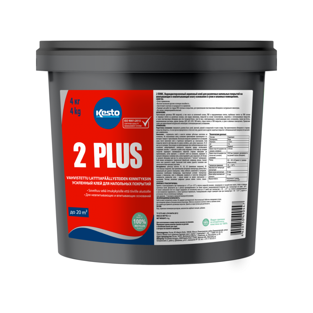 Kesto 2 Plus - воднодисперсионный акриловый клей для приклеивания различных напольных покрытий - рулонных ПВХ покрытий, в том числе на вспененной основе, ПВХ и кварцвиниловых плиток, пробковых плиток на ПВХ основе и ковровых плиток на различных основах, всех видов ПВХ-покрытий, ковролина и иглопрошивных покрытий, а также пластмассовых облицовок для стен толщиной более, чем 0,6 мм, к впитывающим и невпитывающим влагу основаниям в сухих и влажных помещениях.