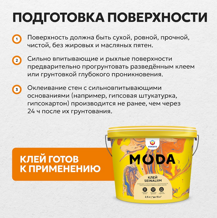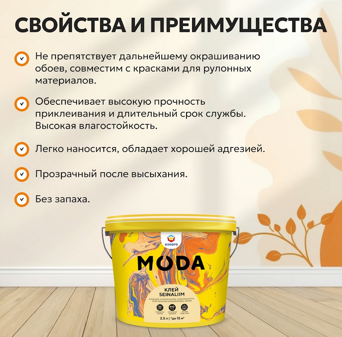 MODA Seinaliim — это высококачественный готовый клей, созданный для надежного приклеивания рулонных настенных покрытий. Обеспечивает безупречную фиксацию даже тяжелых материалов, таких как стеклообои и плотный винил.