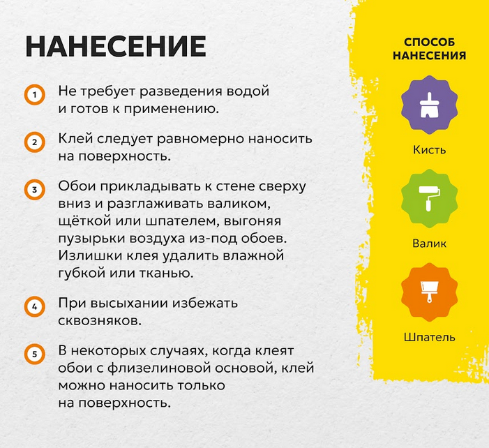 Готовый клей для приклеивания рулонных настенных покрытий в сухих помещениях. Не предназначен для приклеивания материалов из пластмассы!