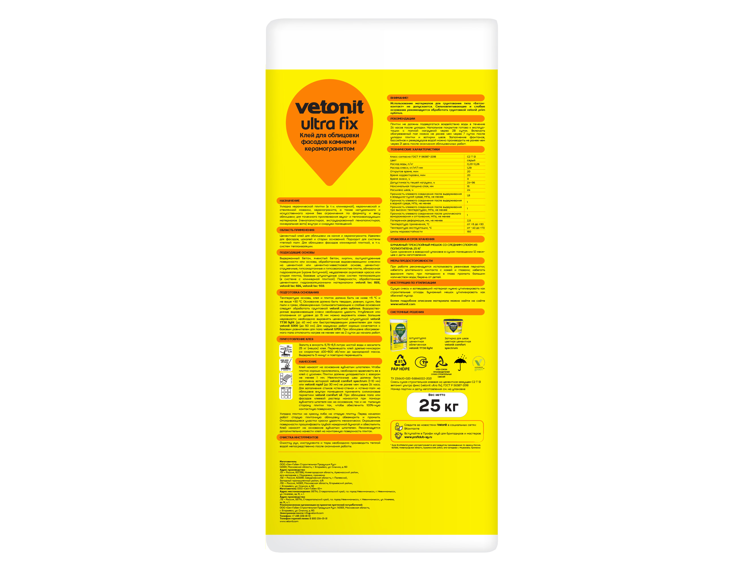 Клей Ветонит Ультра Фикс 25 кг - эластичный и высокодеформативный плиточный клей на цементной основе, предназначен для работы с керамической плиткой, мозаикой, керамогранитом, натуральным и искусственным камнем.
