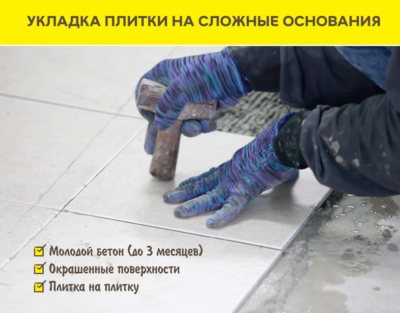 Укладка плитки на гидроизоляцию (кроме битумной), окрашенные поверхности, бетон, ячеистый бетон, ГКЛ, ГВЛ и ЦСП, кирпич, стяжки (в т.ч. с подогревом), штукатурки и шпаклевки на цементной и цементно-известковой основе.