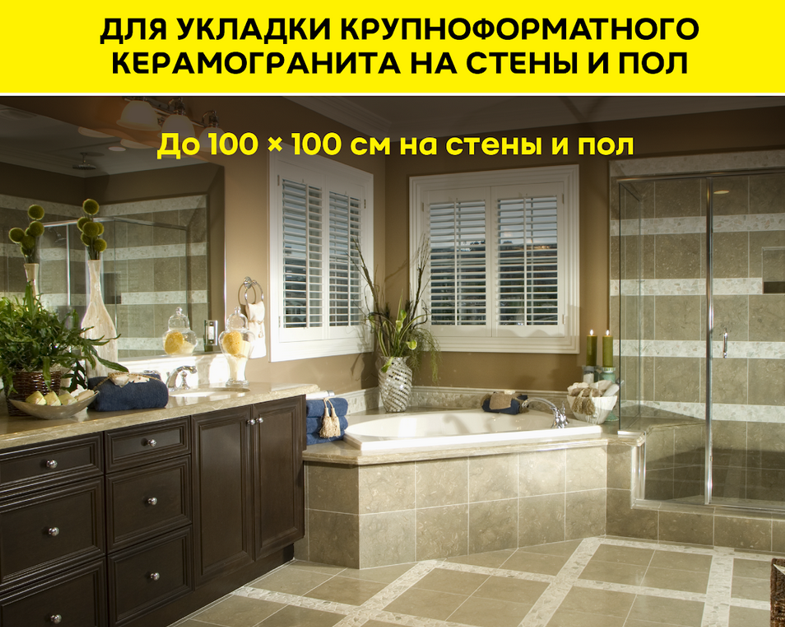 Высокая адгезия к гидроизоляционным материалам (кроме битумных). Подходит для облицовки фонтанов.
