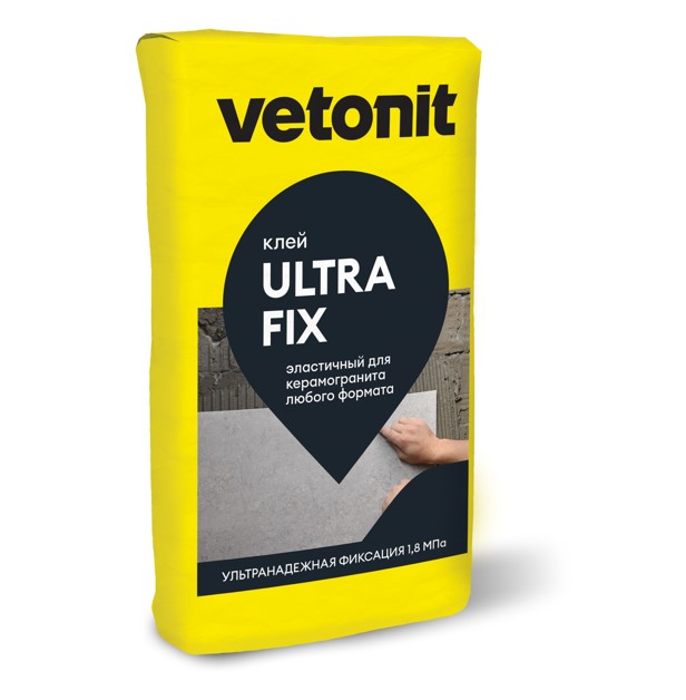 Клей Ветонит Ультра Фикс 25 кг - эластичный и высокодеформативный плиточный клей на цементной основе, предназначен для работы с керамической плиткой, мозаикой, керамогранитом, натуральным и искусственным камнем.