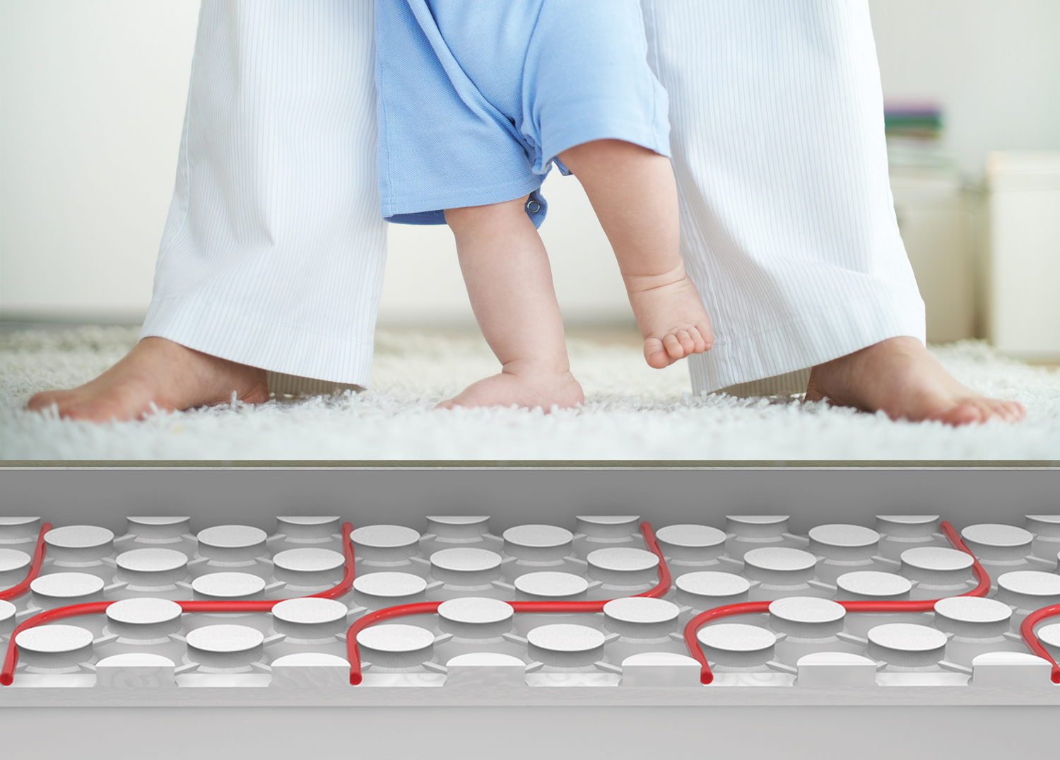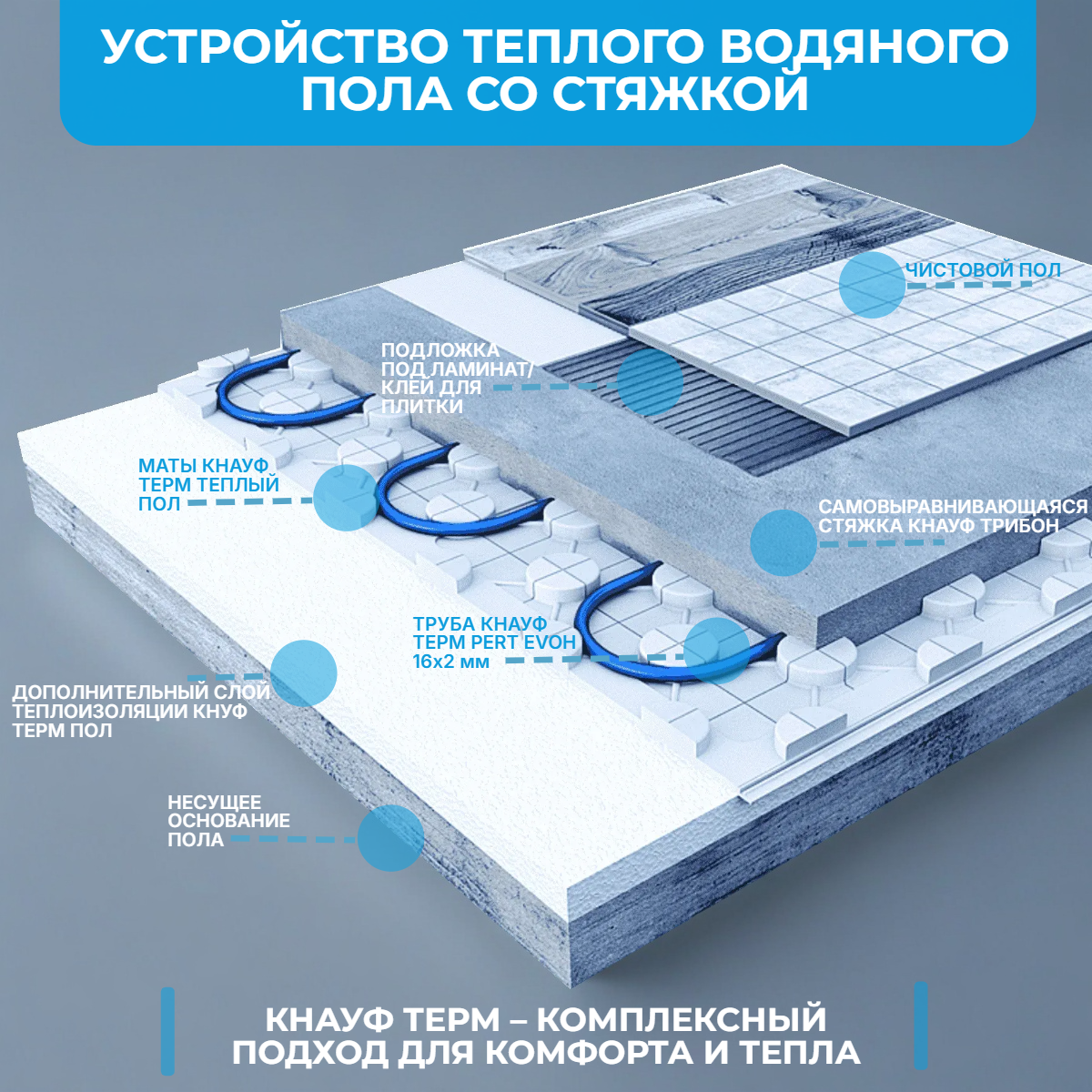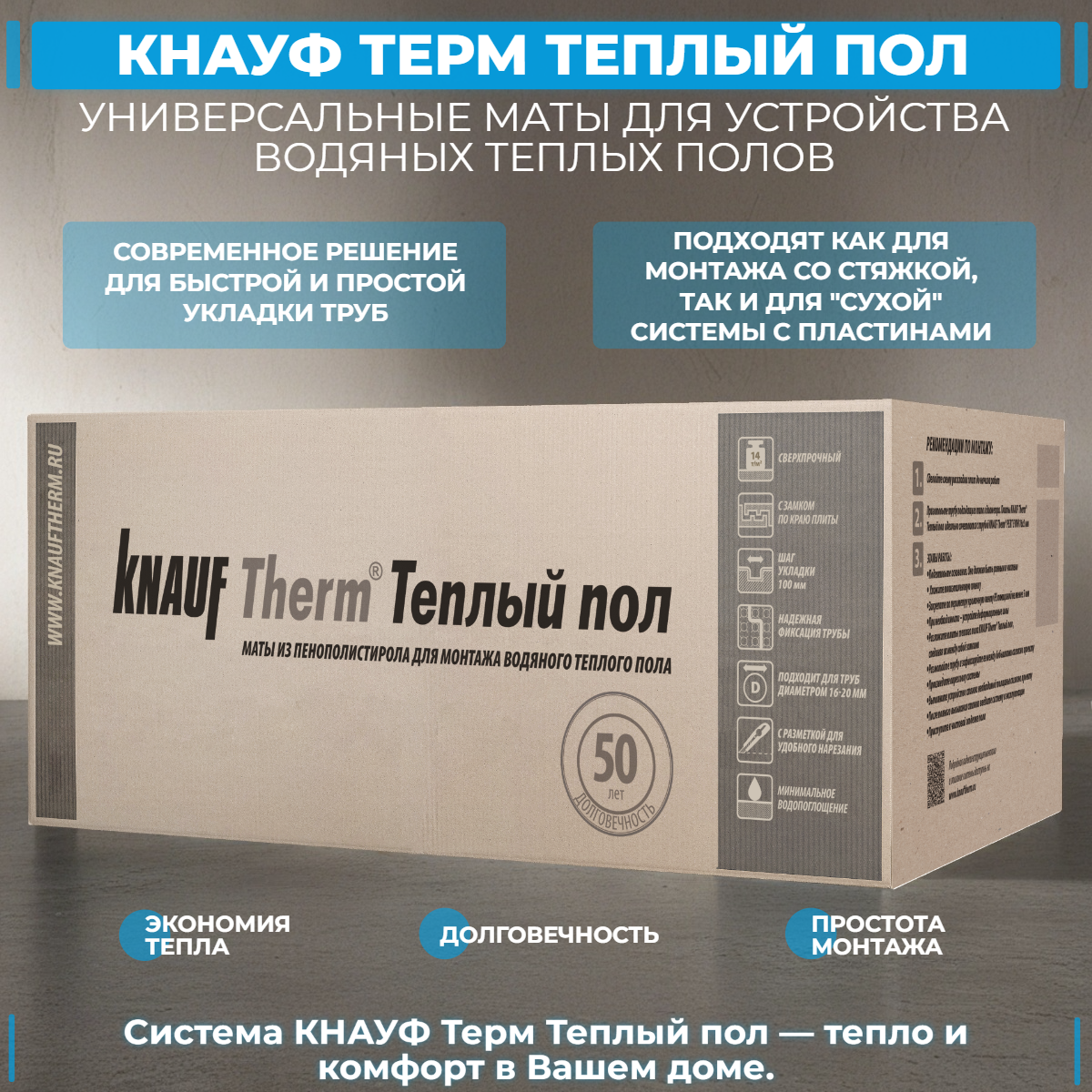 KNAUF Therm® Пенопласт «Тёплый пол» для водяного тёплого пола 600?1200 мм — теплоизоляционные формованные маты из пенополистирола для монтажа систем водяного напольного отопления. «Бобышки» на поверхности помогают быстро разложить контуры и надёжно зафиксировать трубу, благодаря чему монтаж идёт быстрее и часто можно обойтись без металлической сетки и крепёжных скоб. Система подходит как для устройства тёплого пола под стяжку, так и для вариантов «сухого типа» с применением теплораспределительных пластин.