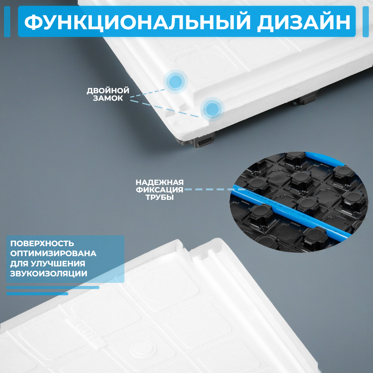 КNAUF Therm® Пенопласт «Тёплый пол PRO» для водяного тёплого пола 600?1200 мм — теплоизоляционные формованные маты из пенополистирола с жёсткой PS-плёнкой для быстрого и аккуратного монтажа систем водяного напольного отопления. Выступы-«бобышки» позволяют быстро разложить контур «улиткой» или «спиралью» и надёжно фиксировать трубы, снижая потребность в сетке, хомутах и скобах. Жёсткая плёнка повышает износостойкость, защищает от влаги и увеличивает срок службы системы, а плотный двойной замок помогает уменьшить «мостики холода». Для удобства раскроя предусмотрена разметка, а обратная сторона выполняет роль звукоизоляционной поверхности. Заявленная долговечность — до 100 лет.