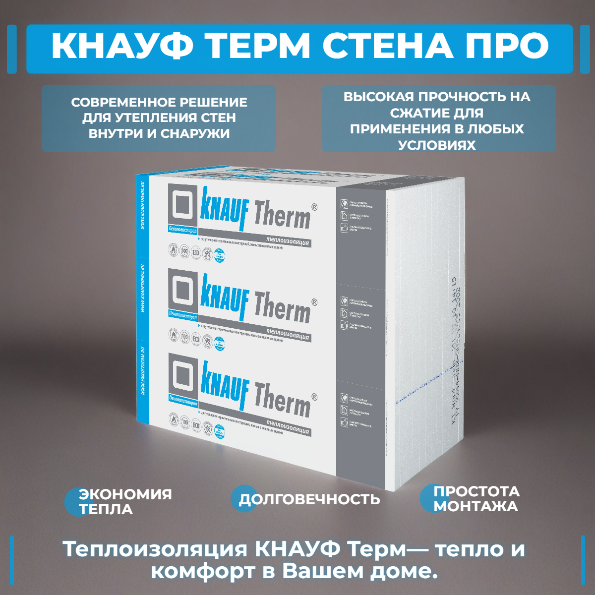 KNAUF Therm® Пенопласт Стена PRO 1000?1200 мм — влагостойкие теплоизоляционные плиты из пенополистирола для утепления различных видов стен в частном и профессиональном строительстве. Материал удобен для каркасных технологий и многослойных стеновых конструкций: плиты помогают снизить теплопотери, повысить энергоэффективность здания и сохранить комфортный микроклимат. По данным производителя, KNAUF Therm® Стена PRO соответствует ППС12, не деформируется в процессе эксплуатации и подходит для задач, где важны стабильная геометрия и предсказуемые свойства утеплителя. Серия Стена PRO обладает теплопроводностью в сухом состоянии 0,042 Вт/м·°С, водопоглощением при полном погружении не более 2%, а прочность на сжатие при 10% деформации — не менее 0,06 МПа. Это делает материал практичным выбором для стеновых систем, где требуется влагостойкость и достаточная прочность плит при монтаже.