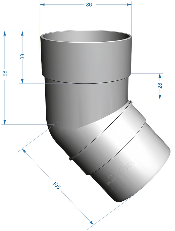 Колено трубы предназначено для перехода от воронки желоба к водосточной трубе и для обхода архитектурных фасадов под углом 45 градусов.