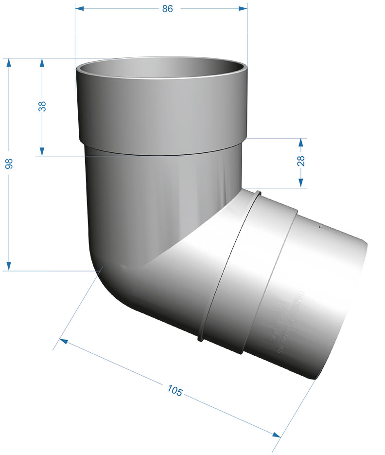 Колено трубы предназначено для перехода от воронки желоба к водосточной трубе и для обхода архитектурных фасадов под углом 72 градуса.