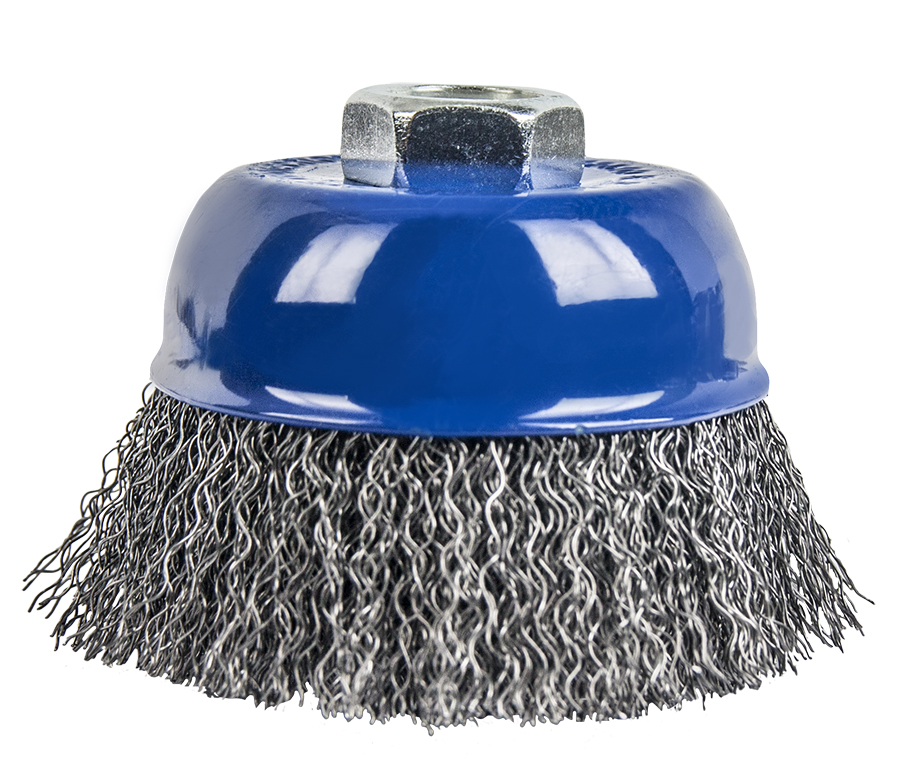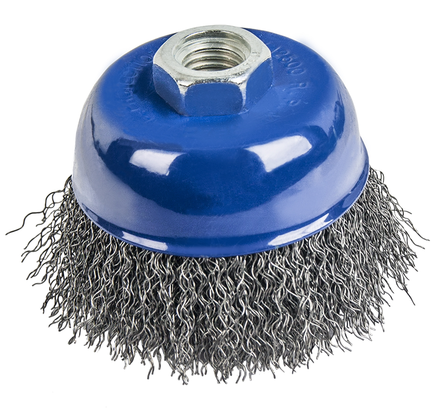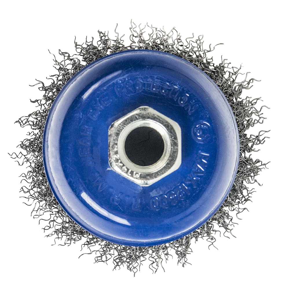 Рабочая часть сделана из гофрированной стальной проволоки диаметром 0,2мм. На посадочном отверстии есть резьба М14 для угловой шлифовальной машины. Используется для обработки дерева, снятия краски, шлифовки металла, снятия ржавчины, обработки сварных швов.