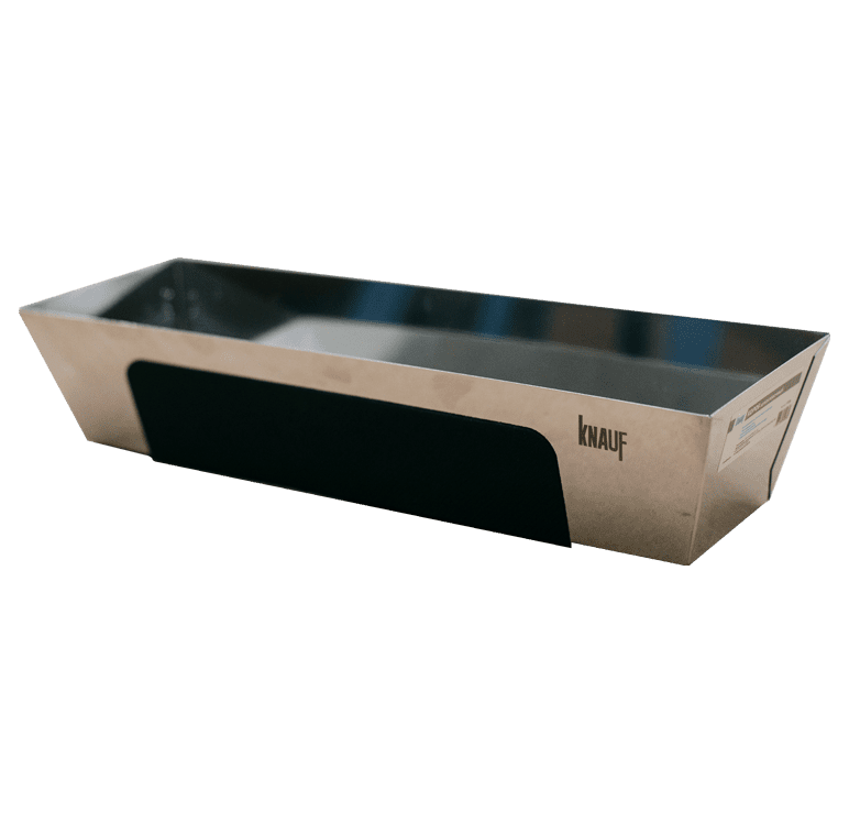 Короб шпаклевочный КНАУФ - ёмкость в форме ванночки, изготовлен из нержавеющей стали с прорезиненной подложкой.