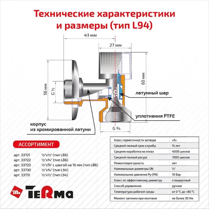 Рабочее давление: 1–10 бар, температура воды до +80°C.