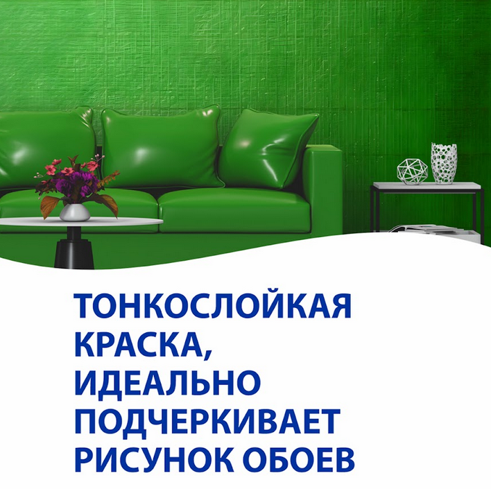 Тонкослойная, идеально прокрашивает и подчеркивает рисунок обоев, позволяет перекрашивать поверхность обоев несколько раз.