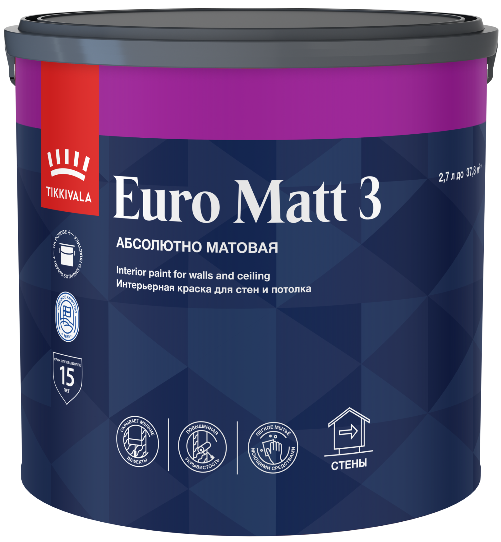 Водоразбавляемая краска для стен и потолка ЕВРО MATT 3 (EURO MATT 3) предназначена для окраски стен и потолков в сухих помещениях по бетонным, кирпичным, оштукатуренным, зашпатлеванным поверхностям, гипсокартону, древесностружечным и древесноволокнистым плитам. Может использоваться в детских учреждениях и помещениях административной группы лечебно-профилактических учреждений.