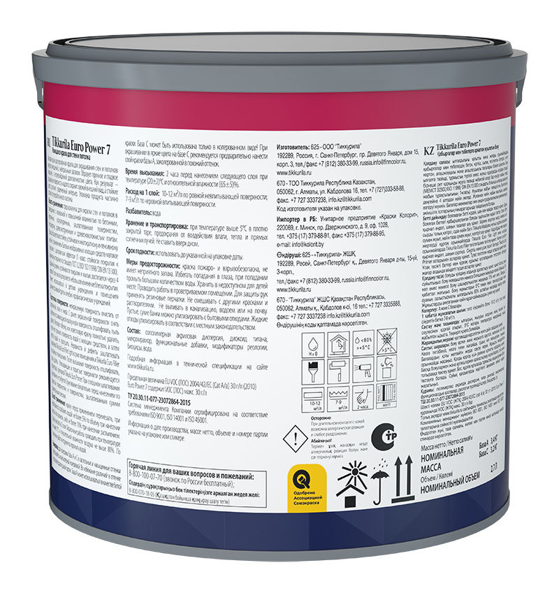 Колеруется согласно каталогам «Тиккурила Симфония» в яркие насыщенные цвета. НЕ использовать без колеровкаи