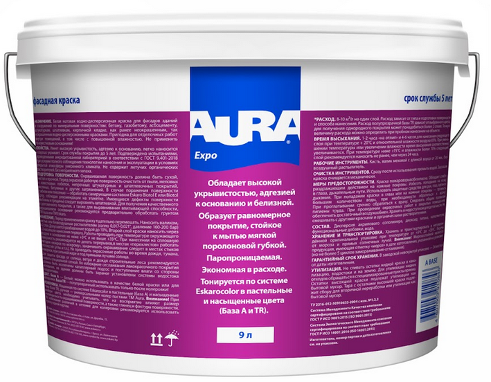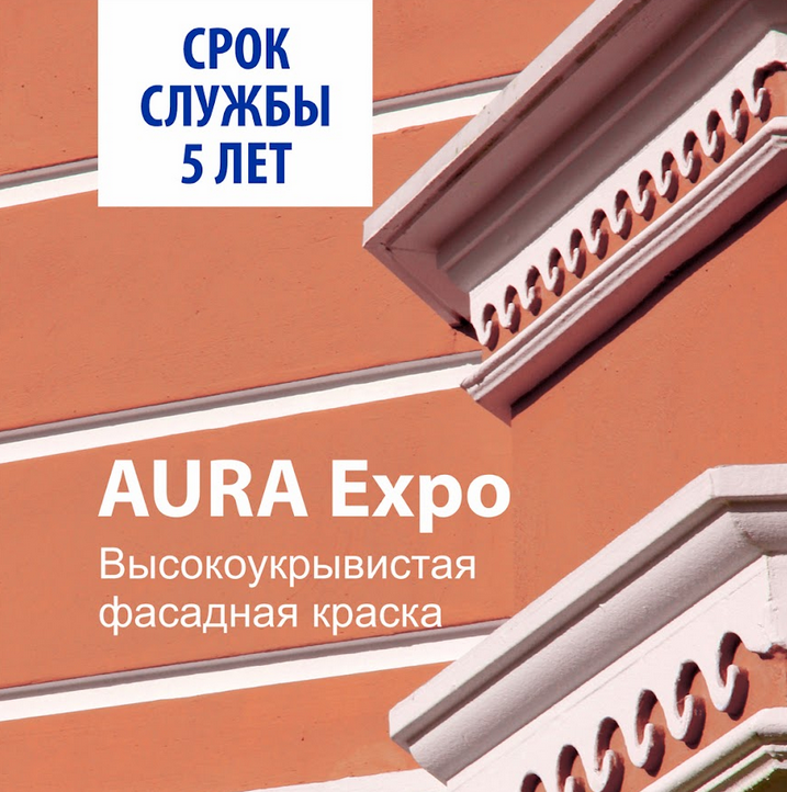 Матовая краска Краска Аура Expo– на водной основе используется для фасадов и помещений с повышенной влажностью.