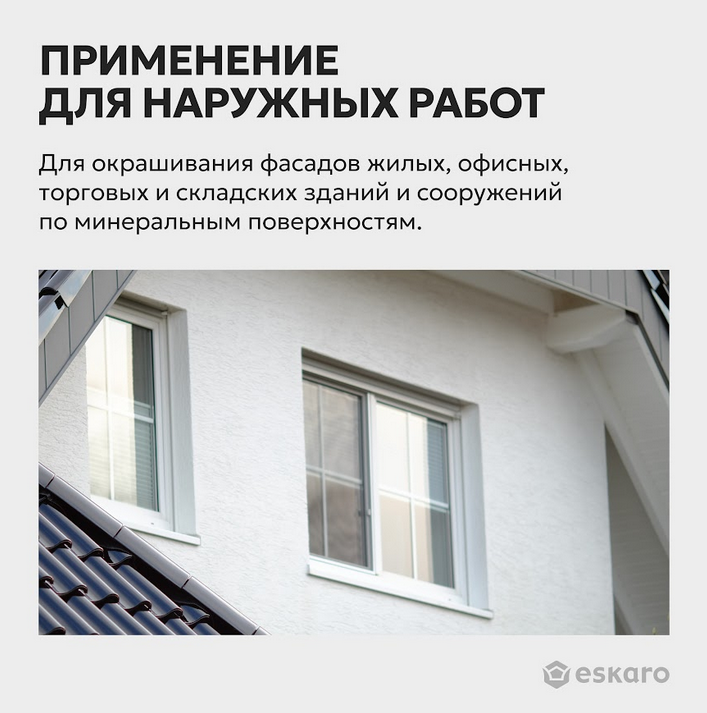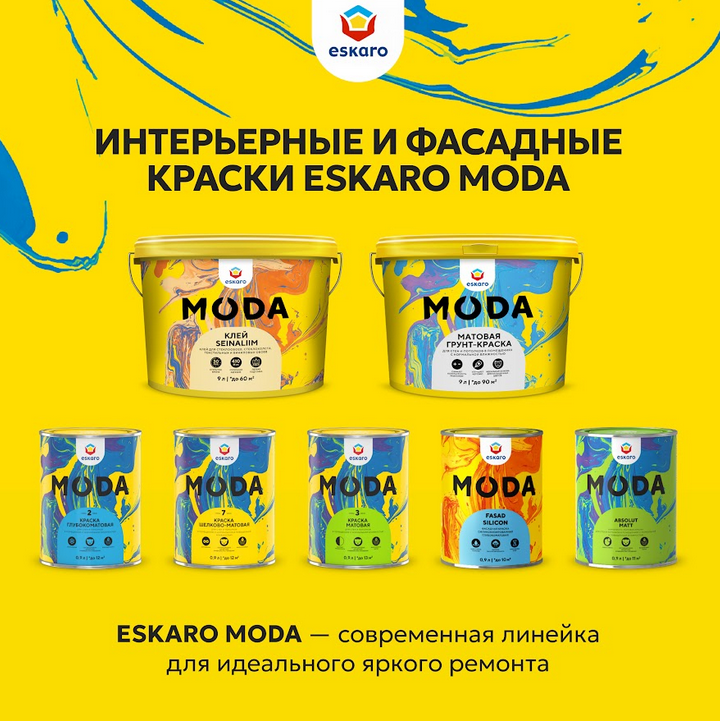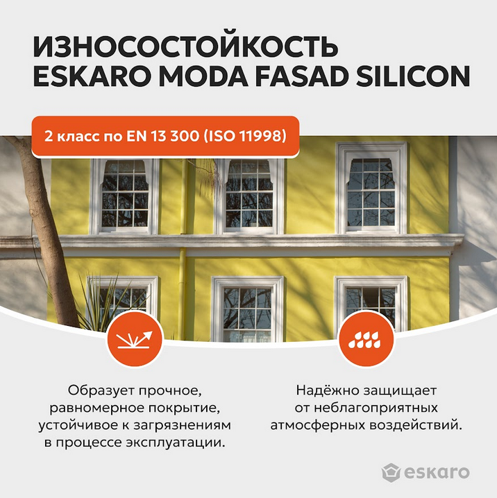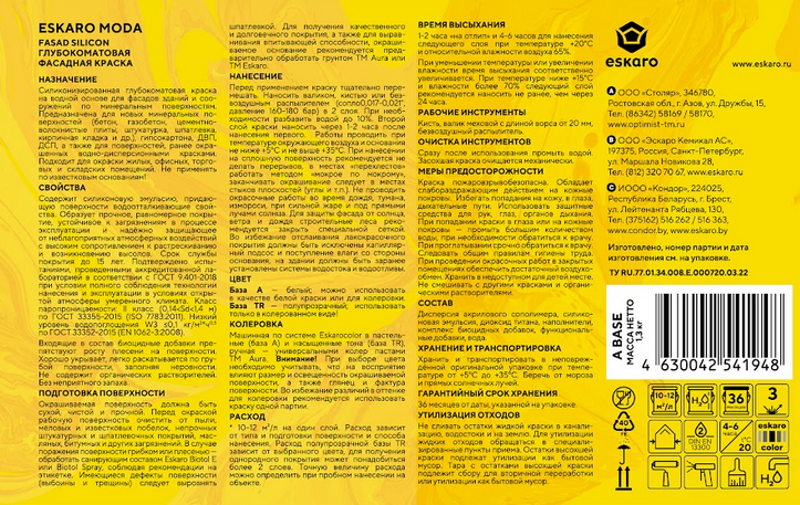 Eskaro Moda Fasad Silicon – фасадная силиконизированная краска. Предназначена для новых минеральных поверхностей, гипсокартона, ДВП, ДСП, а также для поверхностей, ранее окрашенных водно-дисперсионными красками. Подходит для окраски жилых, офисных, торговых и складских помещений. Не применять по известковым основаниям!