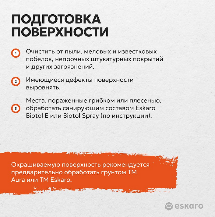 Окрашиваемая поверхность должна быть сухой, чистой и прочной. Перед окраской рабочую поверхность очистить от пыли, меловых и известковых побелок, непрочных штукатурных и шпатлевочных покрытий, масляных, битумных и других загрязнений. В случае поражения поверхности грибком или плесенью – обработать санирующим составом Eskaro Biotol E или Biotol Spray, соблюдая рекомендации на этикетке. Имеющиеся дефекты поверхности (выбоины и трещины) следует выровнять шпатлевкой. Для получения качественного и долговечного покрытия, а также для выравнивания впитывающей способности, окрашиваемое основание рекомендуется предварительно обработать грунтом ТМ Aura или ТМ Eskaro.