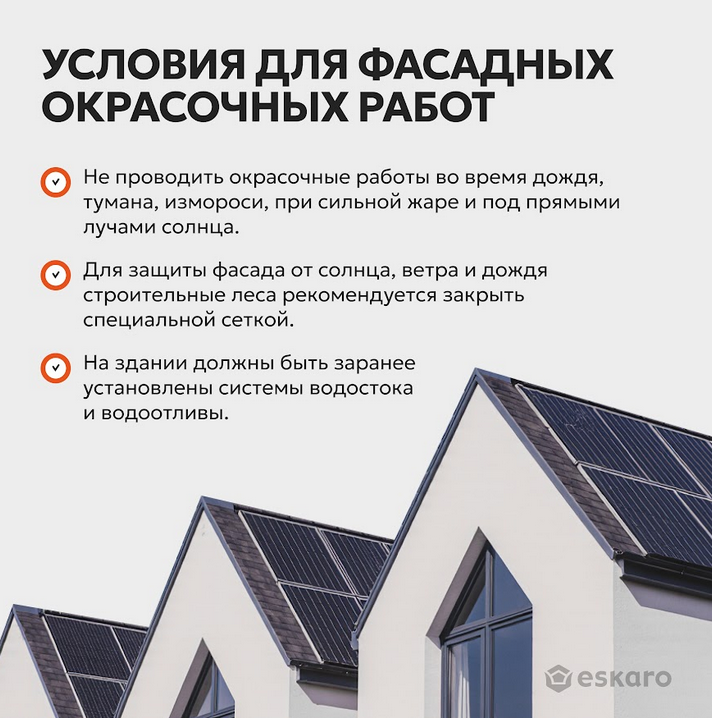Перед применением краску тщательно перемешать. Наносить в 1-2 слоя кистью, валиком или безвоздушным распылителем (сопло 0,021-0,031", давление 150-180 бар). Второй слой краски наносить через 1-2 часа после нанесения первого. Работы проводить при температуре окружающего воздуха и основания не ниже +5?С и не выше +35?С. При нанесении на сплошную поверхность рекомендуется не делать перерывов, в местах «перехлестов» работать методом «мокрое по мокрому», заканчивать окрашивание следует в местах стыков плоскостей (углы и т.п.). Не проводить окрасочные работы во время дождя, тумана, измороси, при сильной жаре и под прямыми лучами солнца. Для защиты фасада от солнца, ветра и дождя строительные леса рекомендуется закрыть специальной сеткой. Во избежание отслаивания лакокрасочного покрытия должны быть исключены капиллярный подсос и поступление влаги со стороны основания, на здании должны быть заранее установлены системы водостока и водоотливы.
