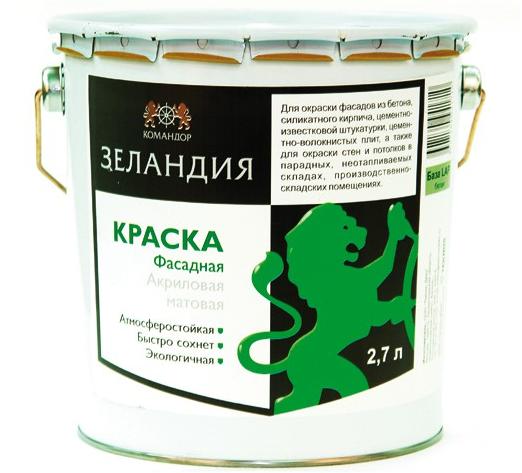 Командор Зеландия - водно-дисперсионная фасадная краска, предназначенная для окраски фасадов из бетона, цементно-известковой штукатурки, силикатного кирпича и цементно-волокнистых плит. Применяется для окраски фасадов зданий, подъездов, промышленных и складских помещений внутри и снаружи и т.д.