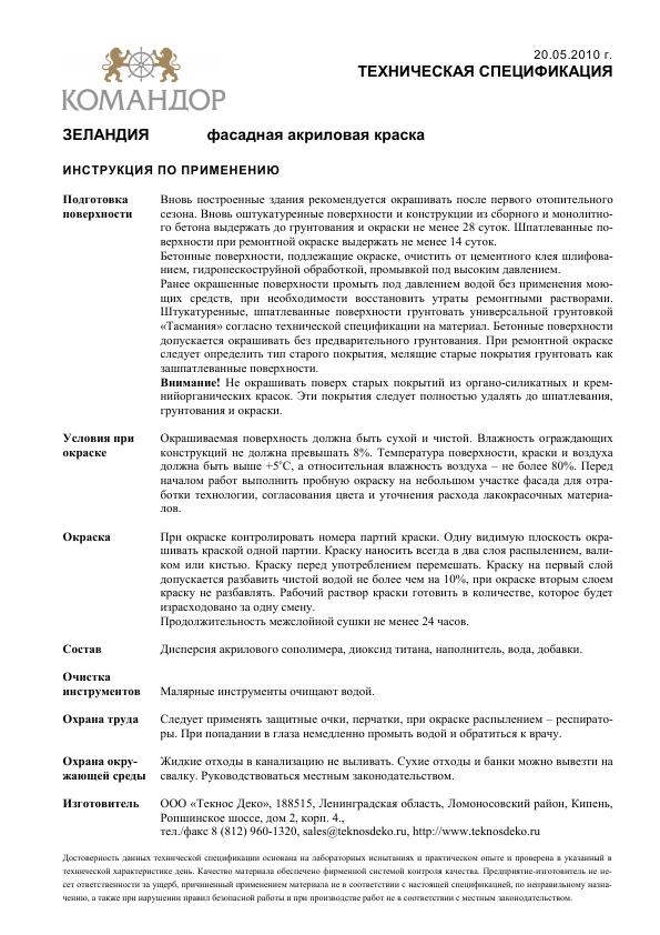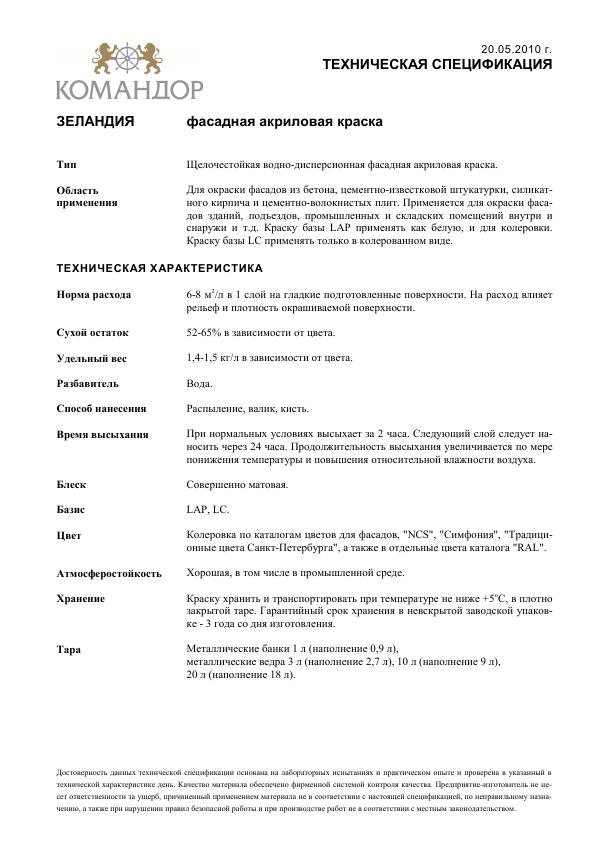Командор Зеландия - водно-дисперсионная фасадная краска, предназначенная для окраски фасадов из бетона, цементно-известковой штукатурки, силикатного кирпича и цементно-волокнистых плит. Применяется для окраски фасадов зданий, подъездов, промышленных и складских помещений внутри и снаружи и т.д.