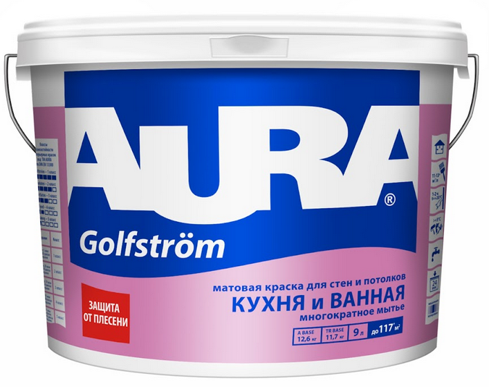 Краска моющаяся Aura Interior Golfstrоm особопрочная для ванной и кухни база А белая 9л