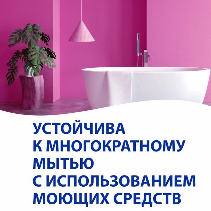Особопрочная краска для ванной и кухни. Предназначена для стен и потолков в помещениях с нормальной и повышенной влажностью (коридоры, кухни, ванные комнаты и др.), а так же для поверхностей, требующих регулярного мытья с применением бытовых неабразивных моющих средств (стены в административных и офисных помещениях и пр.). применяется по ранее неокрашенным или окрашенным водно- дисперсионными красками поверхностям: бетону, газобетону, асбоцементу, штукатуркам, шпатлевкам, кирпичной кладке, ДВП, ДСП, а так же по поверхностям, оклеенным различными рулонными отделочными материалами. Сертифицирована для детских и медицинских учреждений.