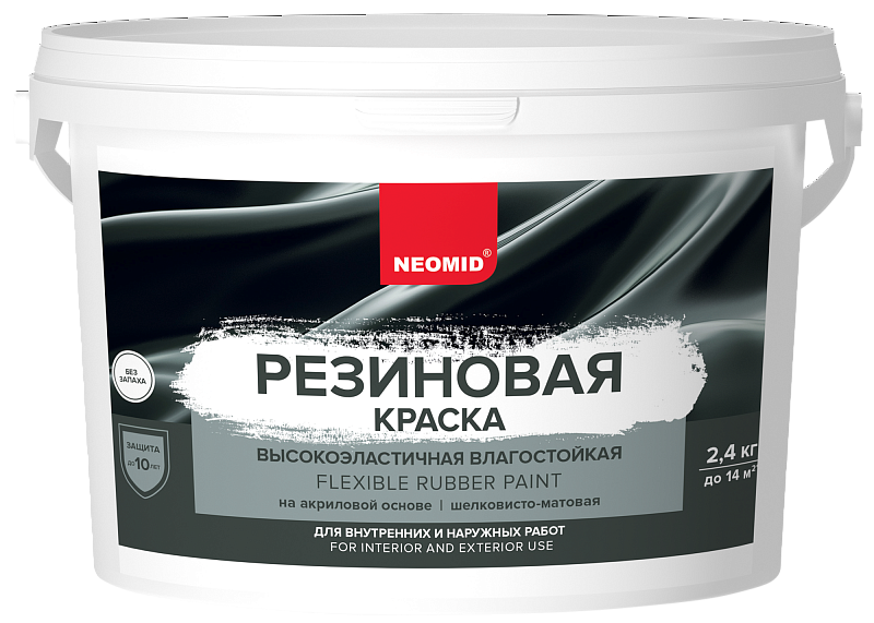 Готовая к применению высокоэластичная влагостойкая резиновая краска НЕОМИД для защитно-декоративной окраски крыш, водосточных систем, заборов, фасадов, фундаментов, подоконников, откосов, бордюров; также подходит для окрашивания стен, потолков и декоративных элементов в сухих помещениях и помещениях с повышенной влажностью (кухни, ванные комнаты, подвалы).