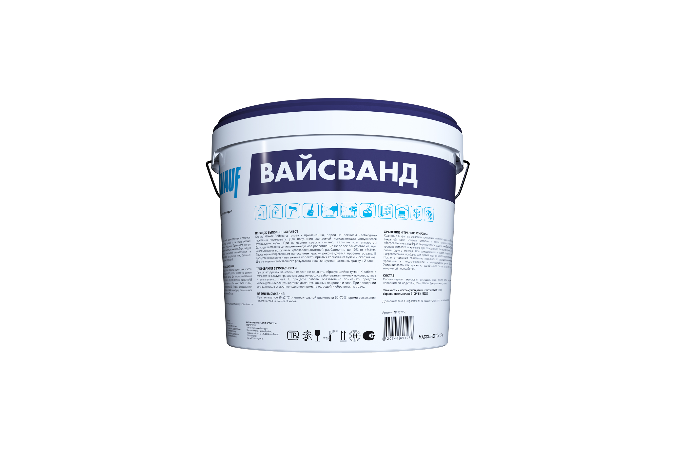 Краска КНАУФ-Вайсванд фасуется в вёдра с герметичной крышкой по 10л (15кг) и 2,5л.