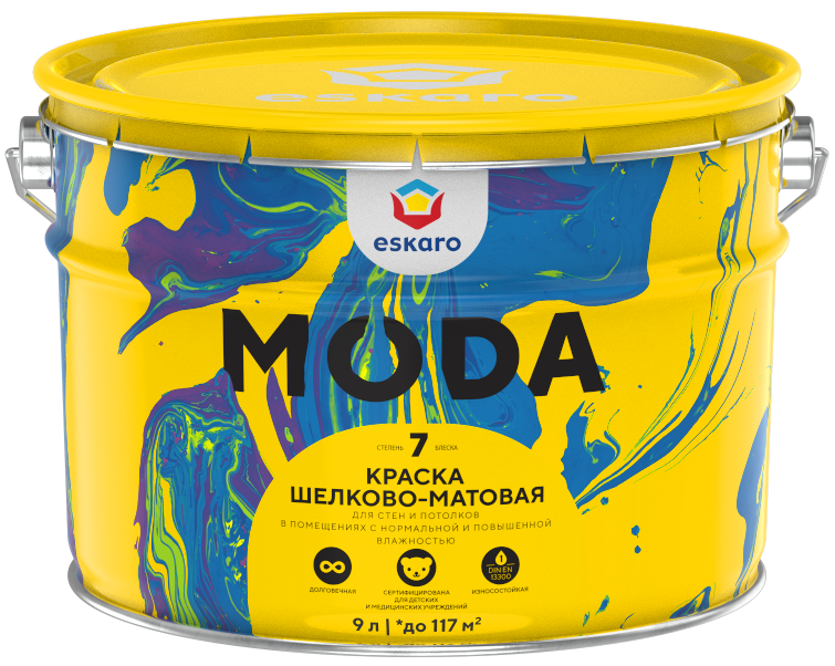 Краска Eskaro Moda 7 - шелково-матовая краска для потолков и стен в помещениях с нормальной и повышенной влажностью.