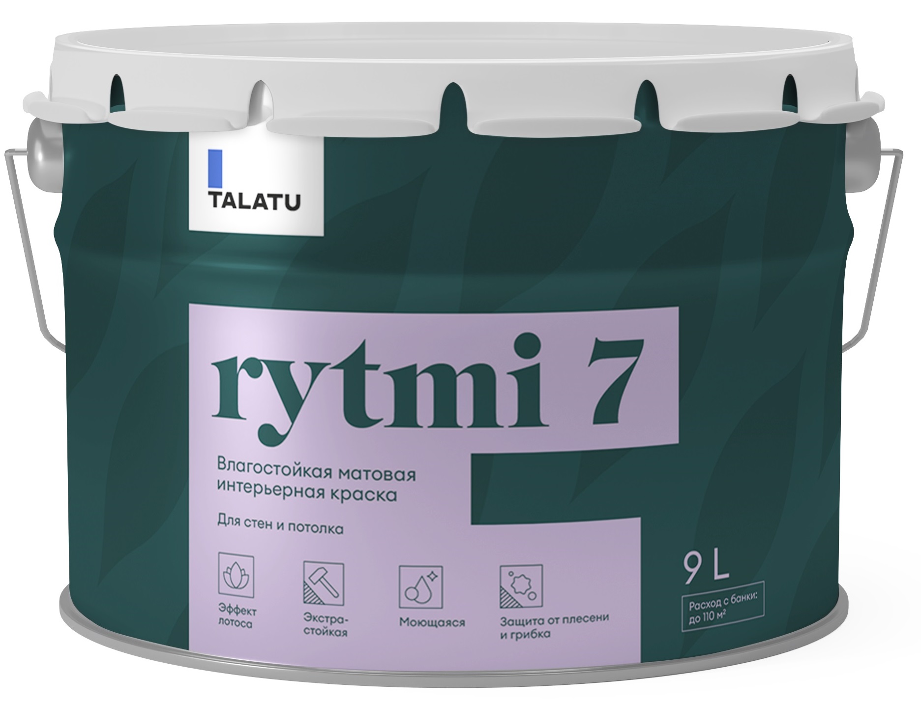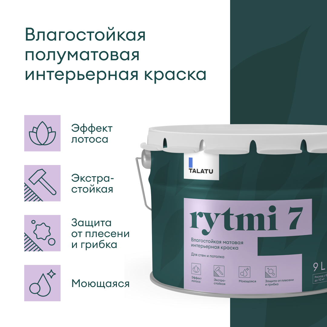 Водно-дисперсионная полиакриловая матовая краска для стен и потолка Talatu Rytmi 7 предназначена для окрашивания стен и потолков в помещениях с высокой эксплуатационной нагрузкой, с нормальной и повышенной влажностью, для коридоров, кухонь, ванных комнат. Применяется по бетонным, оштукатуренным, шпатлеванным поверхностям, гипсокартону, стеклообоям.