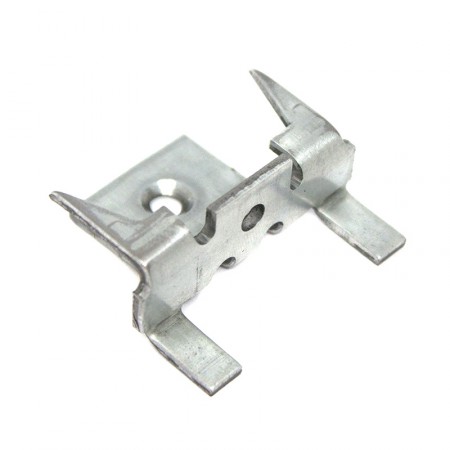 Скрытое крепление для деревянных террасных досок имеет два шипа, находящиеся на различной высоте, что позволяет уменьшать вероятность раскалывания доски вдоль направления волокон.