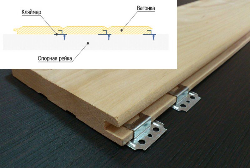 При помощи кляймеров (оцинкованных скоб) осуществляется установка евровагонки. Оцинкованные скобы монтируются на задней стенке паза доски, потом кляймеры крепятся к стене при помощи саморезов или гвоздей. На следующей доске сперва крепится кляймер, затем она стыкуются с верхней доской и кляймер крепится к стене.