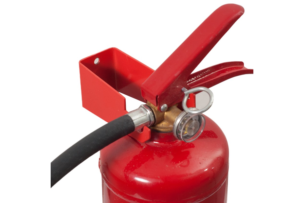Кронштейн крепится к стене, затем на него запорно-пусковым устройством навешивается огнетушитель.