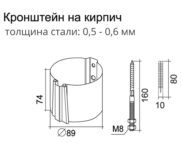 Кронштейн (хомут) водосточной трубы на кирпич - это элемент водосточной системы, предназначенный для фиксации водосточной трубы на кирпичную, каменную или бетонную стену. Поставляется в комплекте с метизом длиной 160 мм под ключ/ биту Torx T25, дюбелем (размер дюбеля 10 х 80мм) и декоративной накладкой.