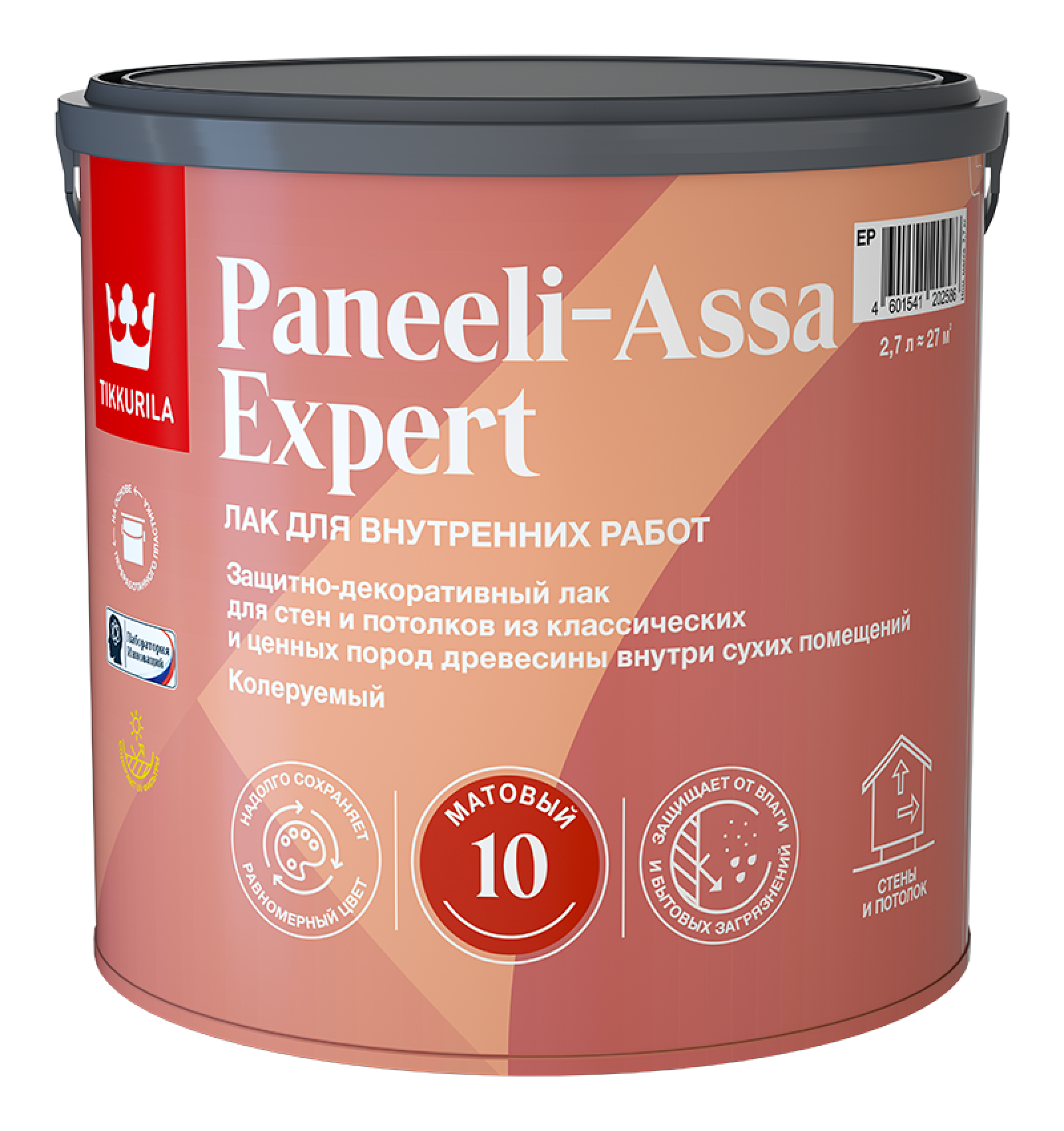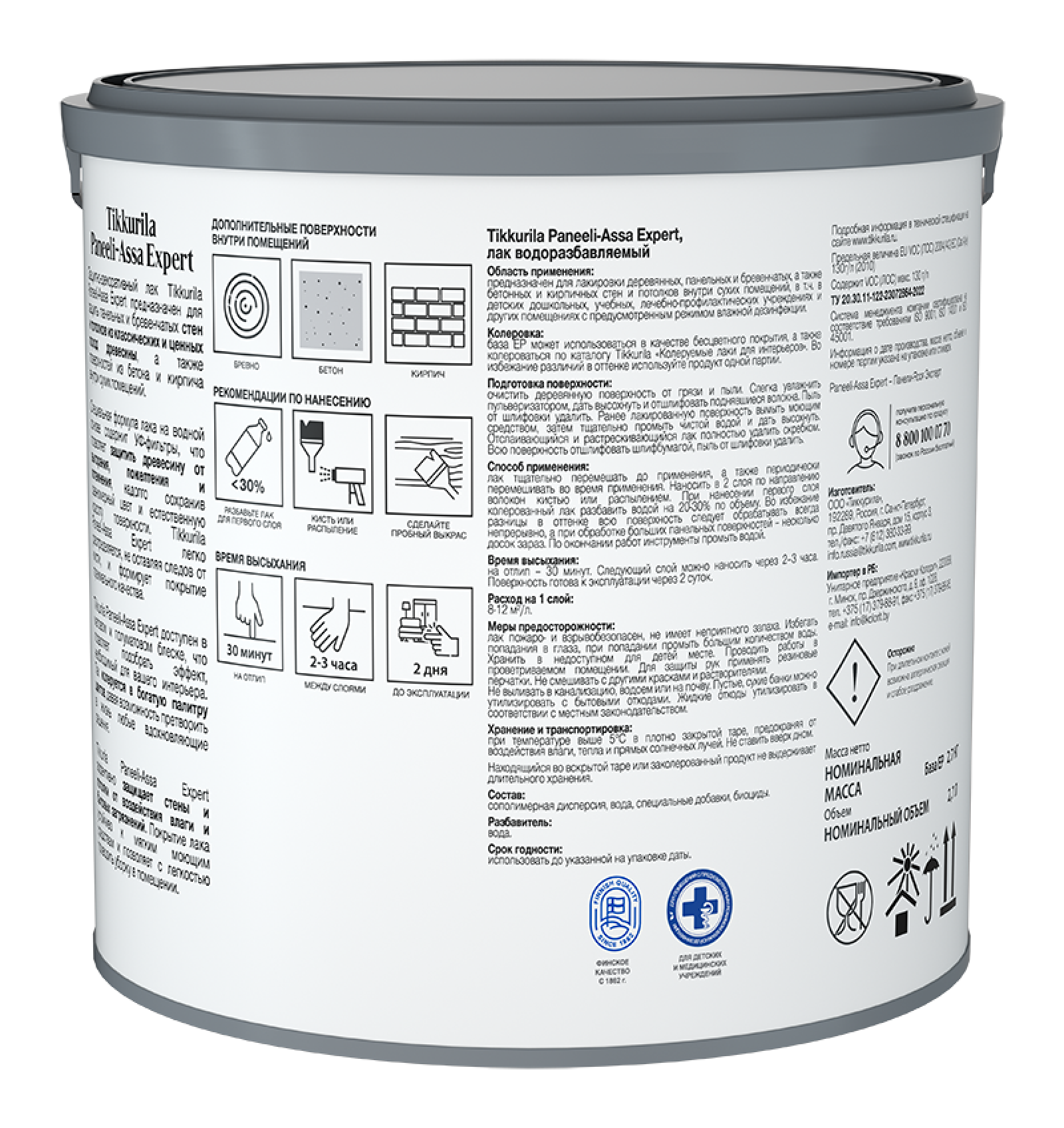 Матовый лак Tikkurila Paneeli-Assa Expert предназначен для лакировки деревянных, панельных и бревенчатых, а также бетонных и кирпичных поверхностей внутри здания. Защищает стены и потолки от механических и других повреждений, одновременно позволяя обновить и украсить интерьер.