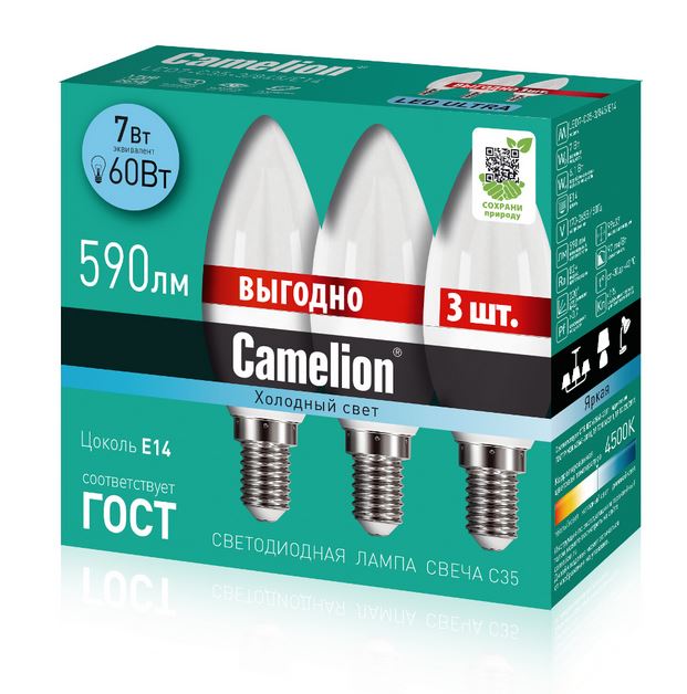 Лампа светодиодная Camelion Свеча С35 Е14 7Вт 4500K нейтральный свет (3 шт/упак)