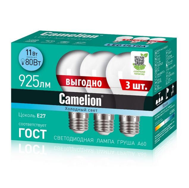 Лампа светодиодная Camelion Груша А60 Е27 11Вт 4500K нейтральный свет (3 шт/упак)