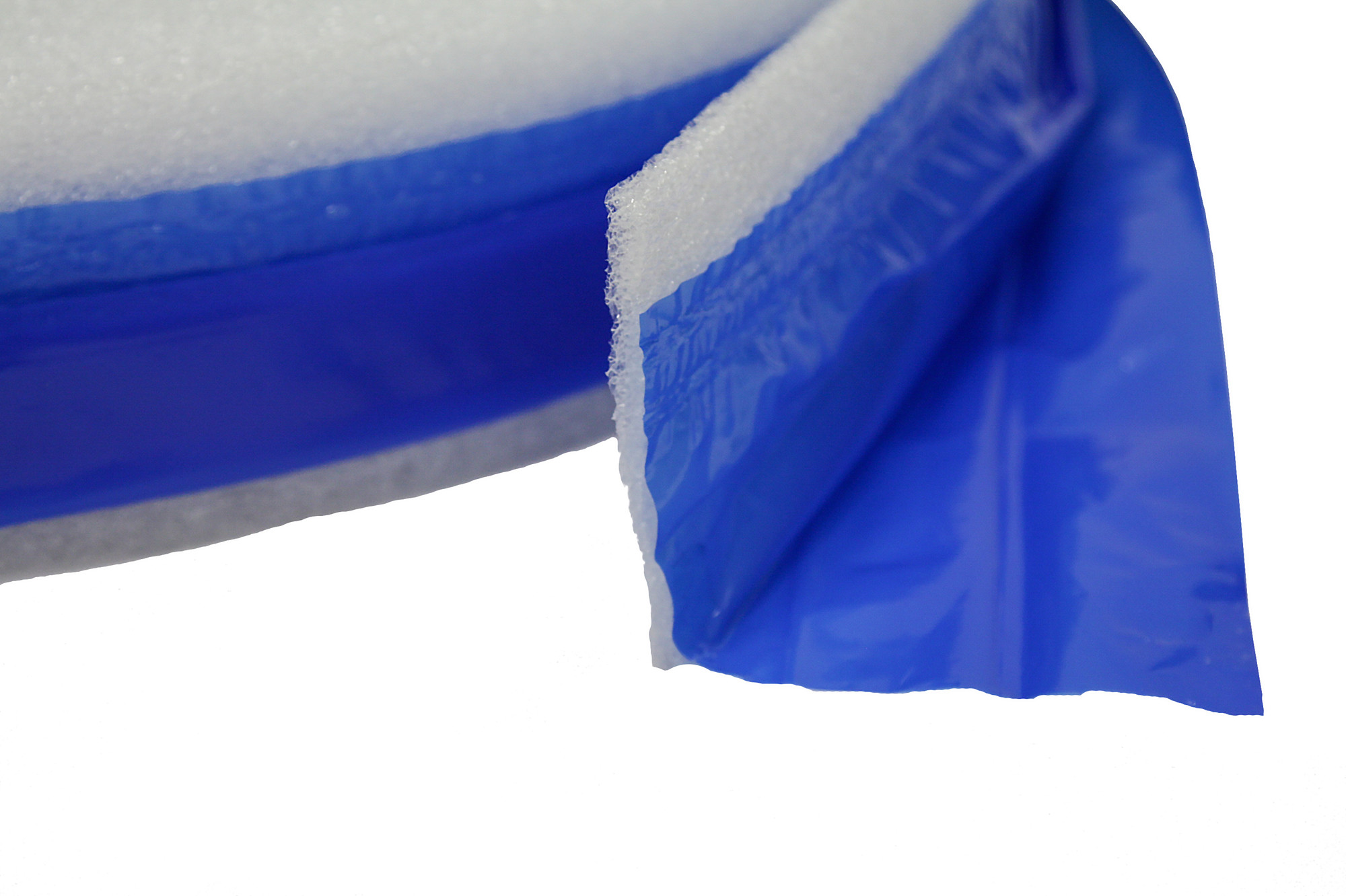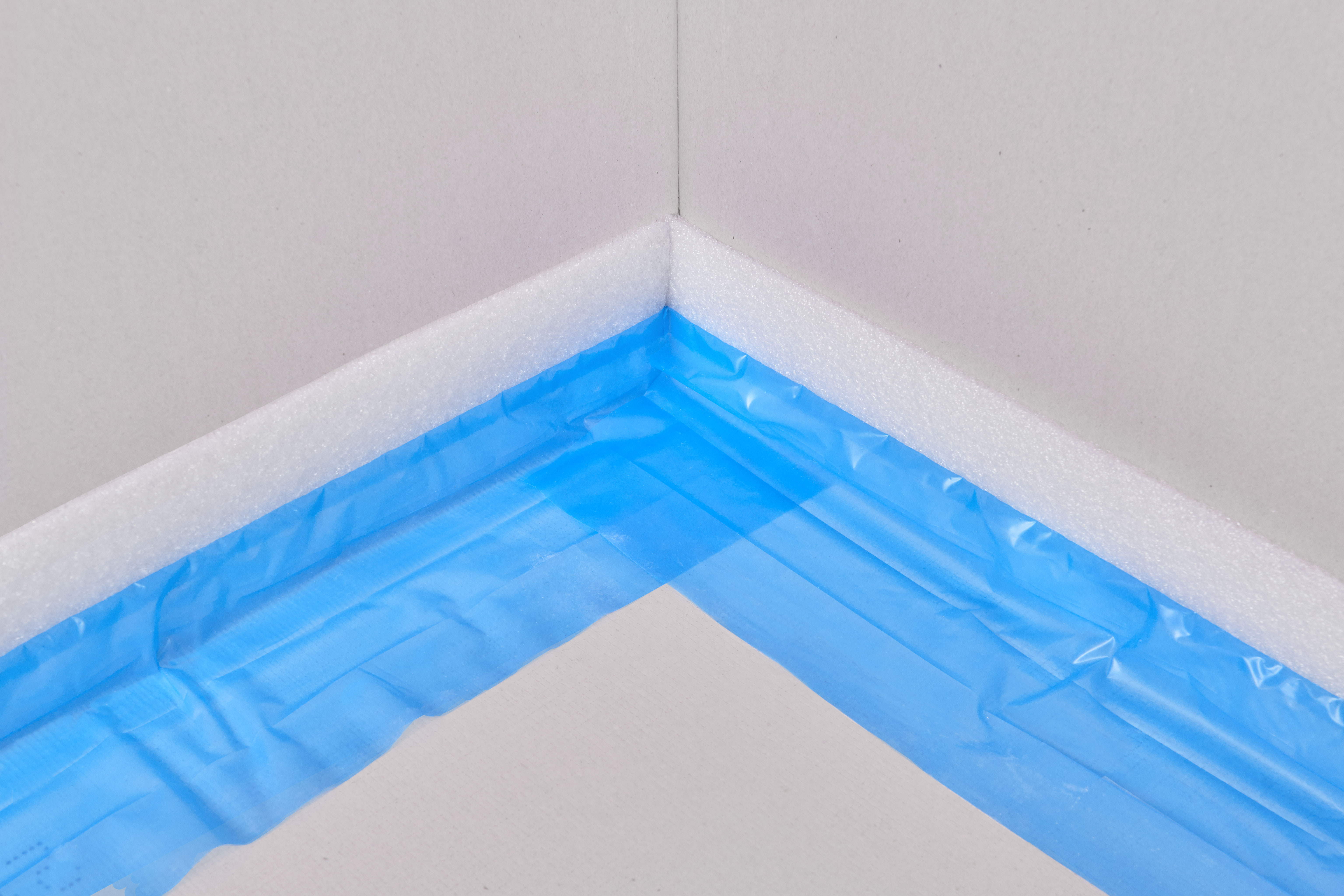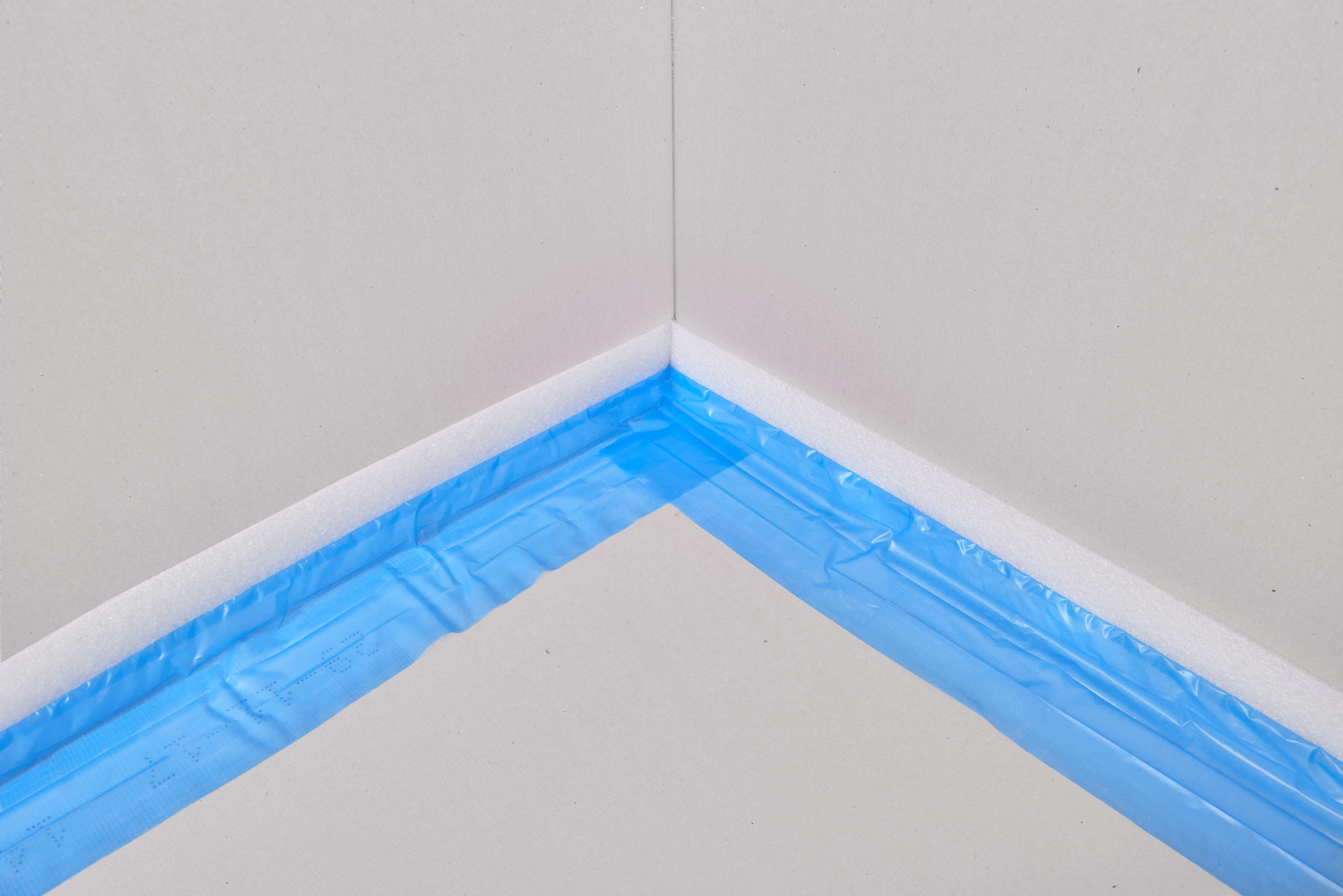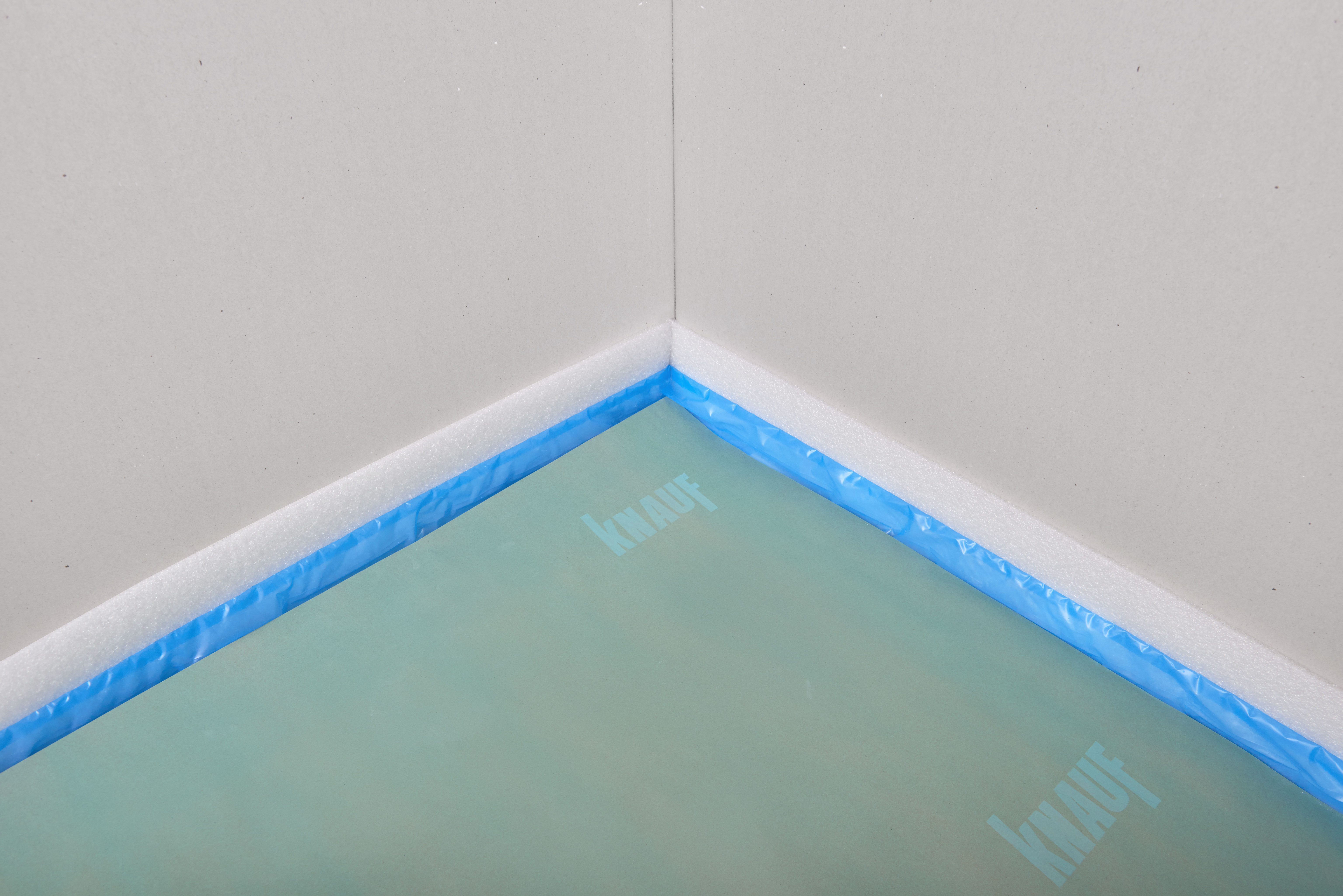 На ленте Knauf FE имеется приклеенная полоса полиэтиленовой пленки, так называемая «юбка» - выступающий отрезок пленки, расположенный по всему периметру ленты. При установке к стене, юбка расправляется по полу, тем самым способствуя герметизации стыка стены и пола.