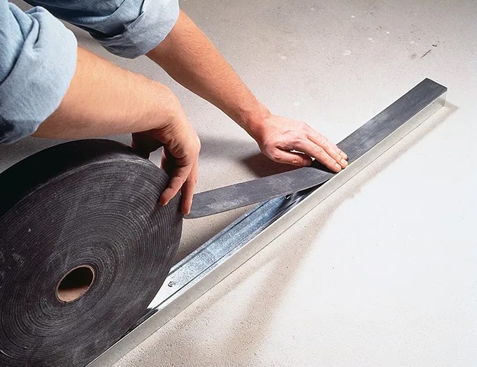Лента Дихтунгсбанд используется для плотного сопряжения металлических профилей каркаса облицовок и перегородок с несущими строительными конструкциями в местах примыкания, а также в качестве звукоизоляционной прокладки при монтаже гипсокартонных конструкций.