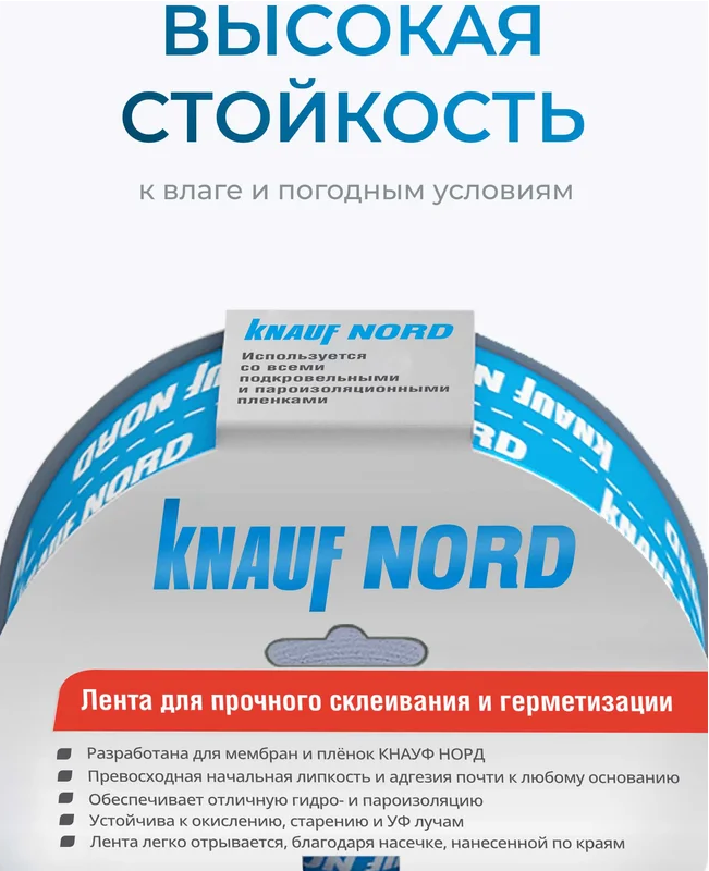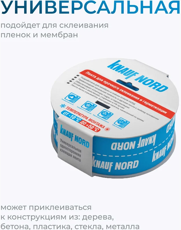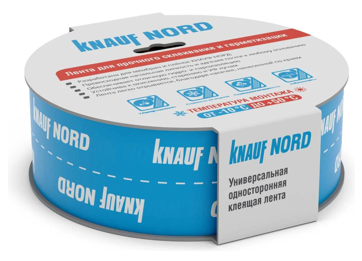 Лента обеспечивает надежное и долговечное соединение с различными материалами, включая дерево, бетон, стекло, металл и пластику. Кроме того, она обладает высокой устойчивостью к воздействию ультрафиолетовых лучей и влаги, что гарантирует долговечность ее эксплуатационных свойств. Температурный диапазон, в котором можно использовать клейкую ленту KNAUFNORD, составляет от -50°С до +80°С, что позволяет применять ее в самых разнообразных климатических условиях.