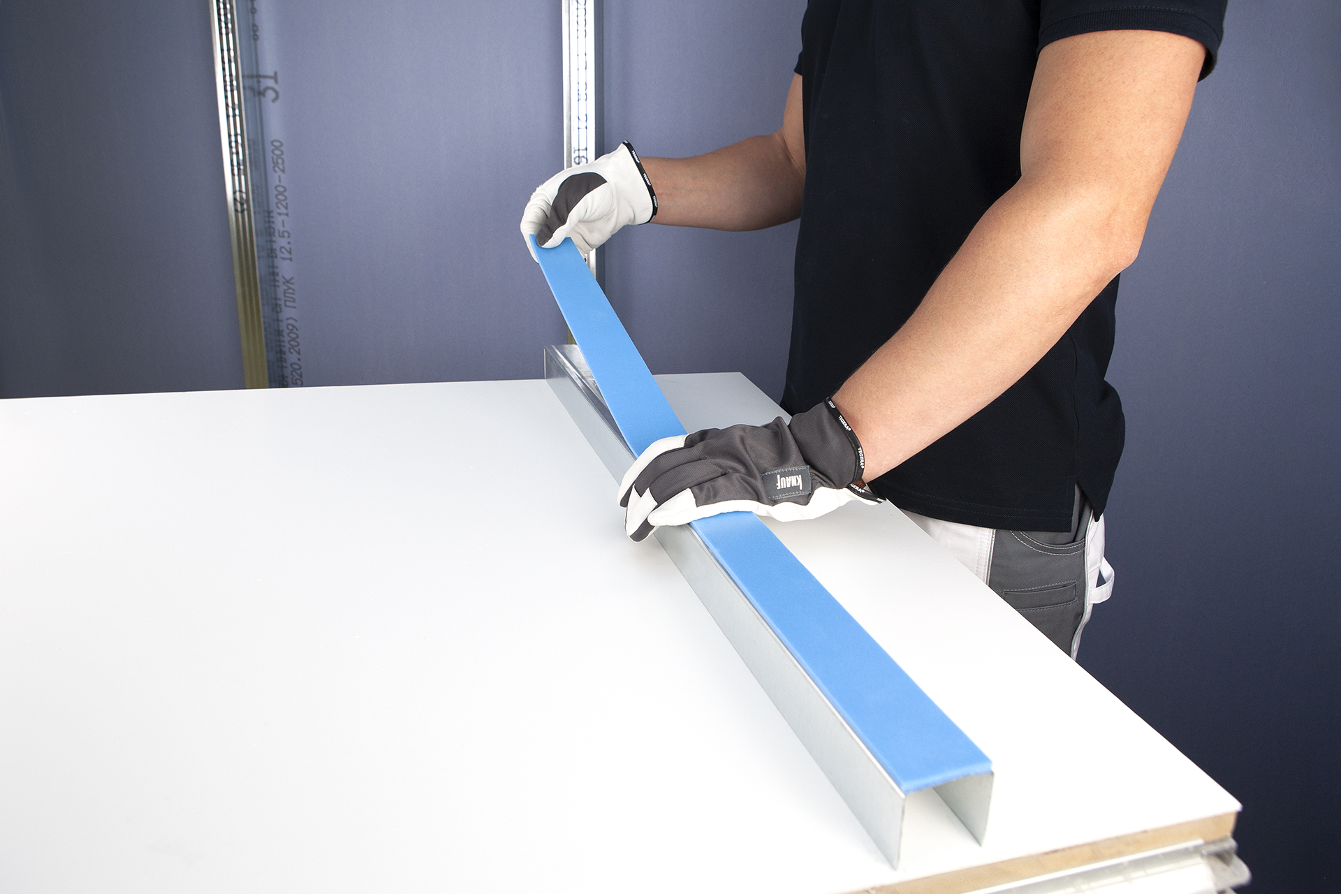 Лента КНАУФ Дихтунгсбанд ПРОФИ применяется в каркасных звукоизоляционных конструкциях в качестве демпфирующего слоя между профилями и обшивкой из листовых материалов. Для улучшения звукоизоляции ленту наклеивают на полки стоечных профилей (ПС) и стенки потолочных профилей (ПП).